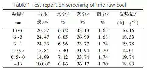 See Table 1 for the screening test data of the last raw coal in the south wing mining area.