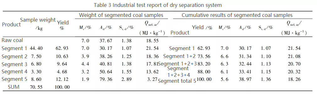 It can be concluded from table 3 that after the dry separation system is used to improve the quality of Minmetals' raw coal, high-quality coal with a calorific value greater than 21.54 mj/kg and low-quality coal with a calorific value less than 21.54 mj/kg are obtained, and the yields are 62.93% and 37.07% respectively. The high-quality end coal with a calorific value greater than 21.54 mj/kg is loaded on the railway for export. The low-quality end coal with a calorific value less than 21.54 mj/kg is mixed with medium coal, some low-quality end raw coal and some high-quality end raw coal to form mixed distribution Coal with a calorific value of 14.63 ~ 15.47 mj/kg for use in gangue power plants.