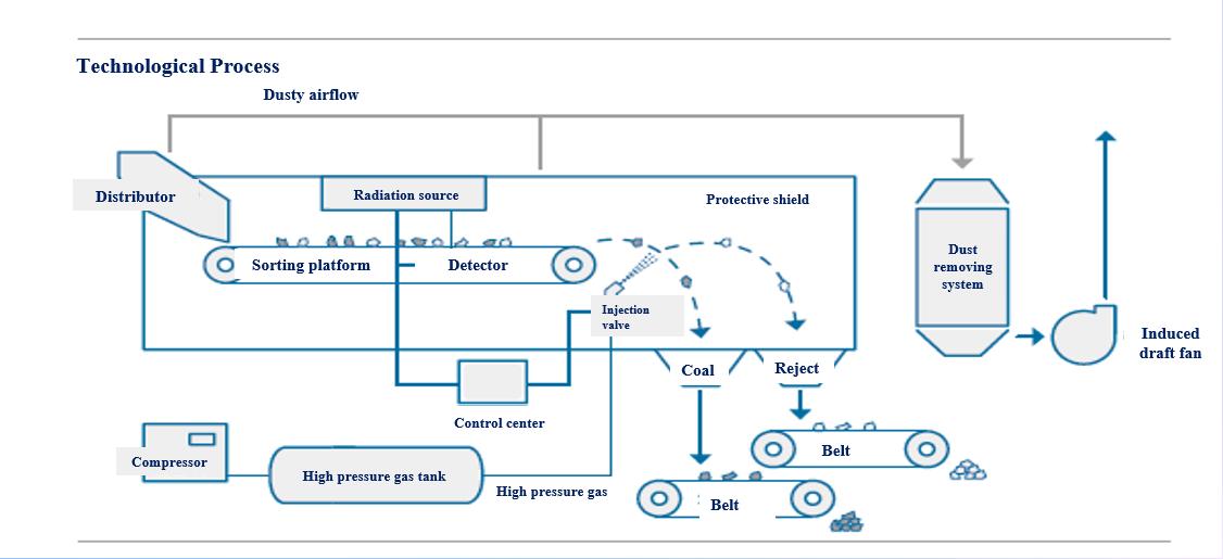IDS X ray separator is an intelligent separation equipment independently developed by Tangshan Shenzhou group, which is suitable for the separation of coal and reject with particle size of 25-300mm. The equipment adopts intelligent identification method and carries out digital identification of coal and reject through big data analysis. It has the advantages of high separation efficiency, stable operation, complete intelligence and no manual duty. IDS X ray separator is divided into two types: 25-100mm and 50-300mm. The processing capacity can be adjusted according to user requirements. It is an ideal equipment to replace manual sorting of large particle size materials. The equipment has the advantages of simple operation, convenient maintenance, no water consumption and very low energy consumption. The whole system operates in a closed way and adopts the high-efficiency dust removal system independently developed by our company. The whole set of equipment does not cause damage and pollution to the environment and meets the environmental protection requirements specified by the state. It is very suitable for application in coal preparation site. The successful development of IDS X ray separator solves the problem of dry separation of large particle size coal in China for a long time, and fills the blank of intelligent separation of large particle size coal in the market.