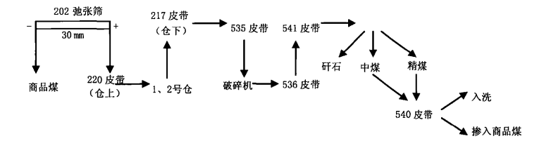 原設計流程采用30-80mm風選后,精煤落地作為動力煤銷售,由于井下煤質不斷變化,在煤質較差時,商品煤發熱量較低,通過設計540轉載皮帶,將風選后的精煤與商品煤混合,提高商品煤質量。另外,風選精煤經過簡單排矸后,也可通過540皮帶轉載進入重介系統,提高重介洗選精煤回收率。