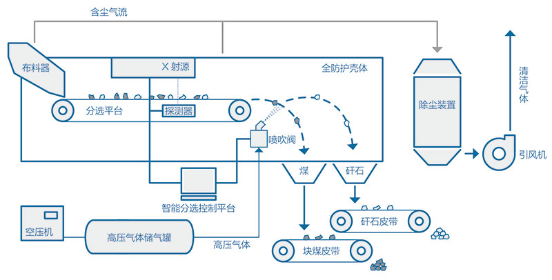 2. 識別精度高,采用雙源 X 射線識別,經大數據分析平臺運算建模,確定精煤和矸石位置并實時上傳。